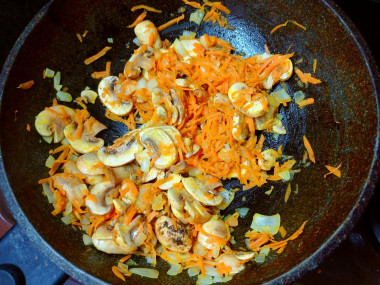 Почистите морковь и лук, промойте и нарежьте их кубиками. Грибы промойте, просушите и нарежьте четвертинками. Разогрейте растительное масло в сковороде. В горячее масло выложите лук и морковь и обжарьте, помешивая, до слегка золотистого цвета. О том, как подобрать идеальную сковороду, а также как правильно выбрать растительное масло, читайте в отдельных статьях, ссылки в конце рецепта.