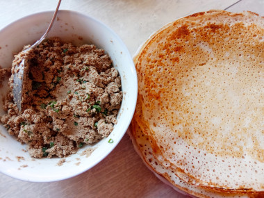 Блинчики получились вкусными и очень аппетитными! За счет того, что печеночная начинка сама по себе не очень сочная, то блинчики лучше употреблять в прикуску со сметаной или греческим йогуртом. Спасибо автору за рецепт! Рекомендую к приготовлению!