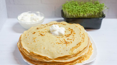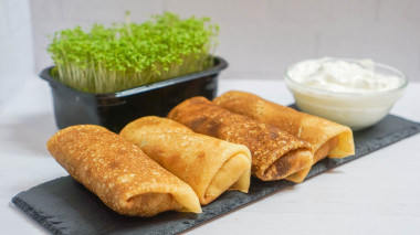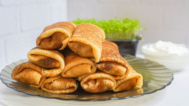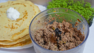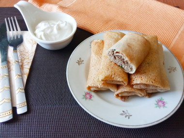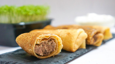 5. В блины завернуть печеночную начинку. К столу подать со сметаной. Приятного аппетита!