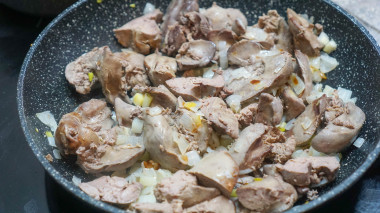 2. Вареную печенку пропустить через мясорубку. Добавить к луку и обжарить 2 минуты, посолить. Затем измельчить печеночную массу в кухонном комбайне.