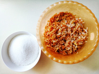 Яблоки помойте, удалите хвостики и сердцевину. Очистите от шкурки и нарежьте на кусочки. Натрите яблоки на терке, добавьте сахар и тщательно перемешайте. Если сорт яблок сам по себе сладкий, желательно добавить меньше сахара. Соответственно, если они почти не сладкие, придется добавить больше сахара, чем указано в составе.