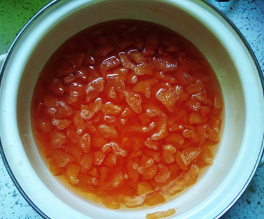 У меня попались сочные плоды, сока выделилось очень много. Если у вас сока будет мало, влейте немного воды. Совсем чуть-чуть, на треть всего объема плодов.