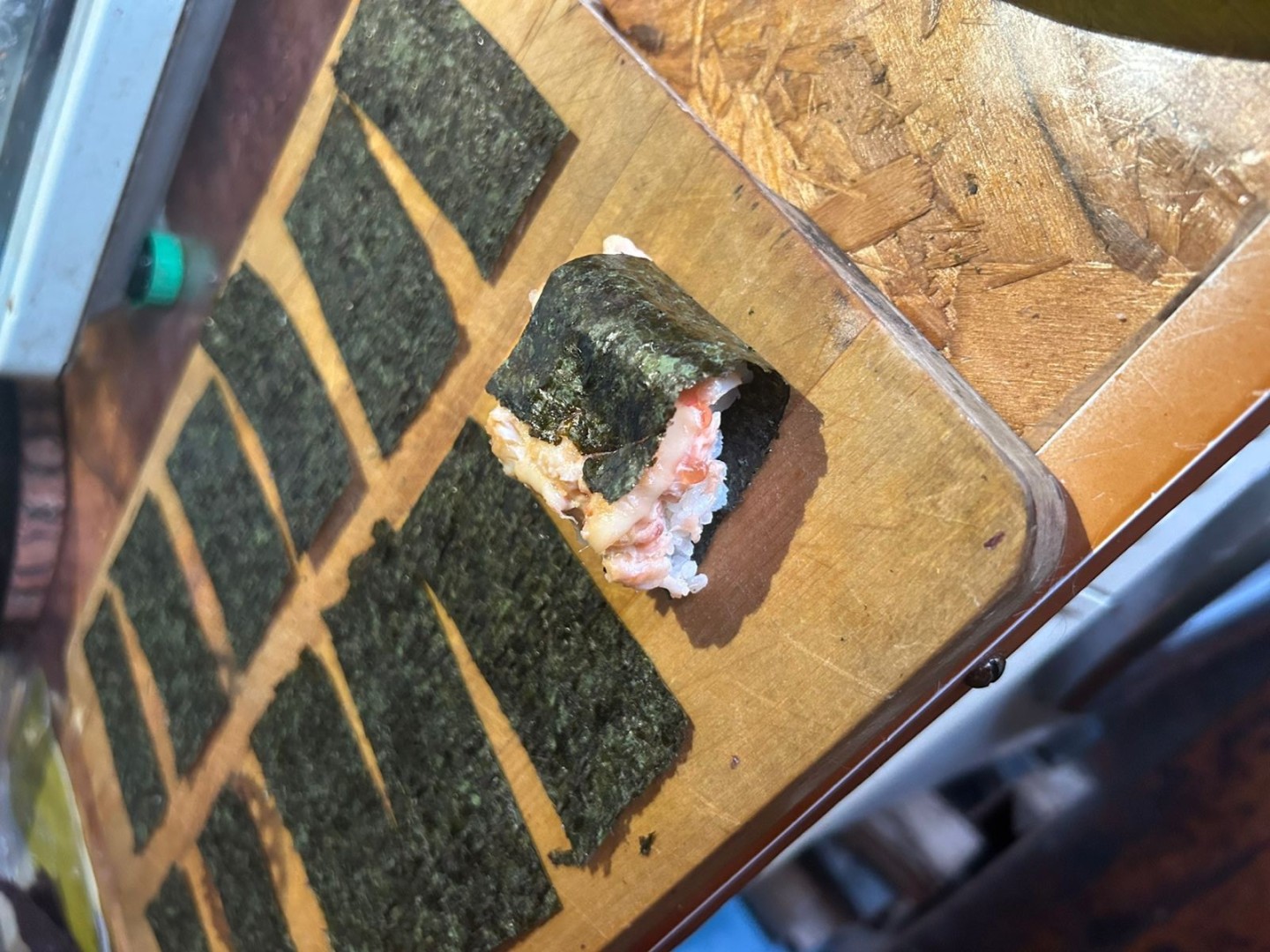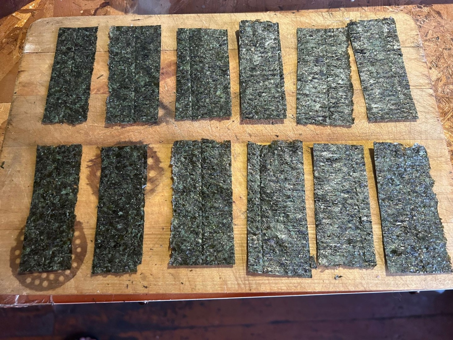 Запеченный пирог нарезал ножом на кубики, которые вилкой выкладывал на подготовленные полоски нори и подворачивал.