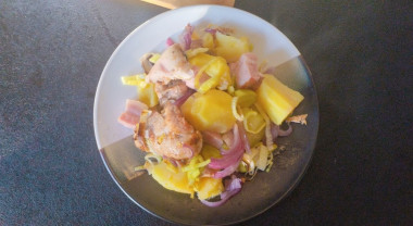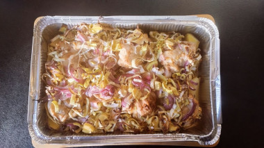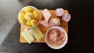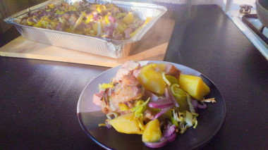 У меня был лук порей и я его использовала вместо белого лука. Вместо кусочков курицы на кости взяла филе бедра без кожи, а картошку предварительно подварила 10 минут. Первые 30 минут готовила под фольгой и еще 15 минут без.