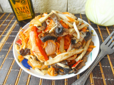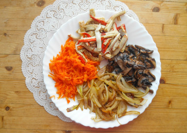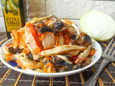 Решила приготовить салат с жареным крабовыми палочками. Я заранее отварила морковь, остудила и натëрла на крупной тëрке. Далее я обжарила крабовые палочки на растительном масле, в этой же сковородке обжарила грибы, а затем и лук. Всё смешала в глубокой миске, добавила немного соли и оливковое масло прямого отжима. Салат получился нежный, с ярким вкусом грибов и крабовых палочек.