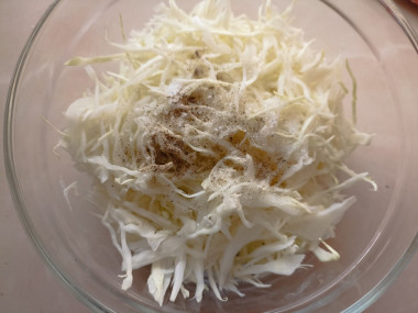 Сложите нарезанную капусту в салатник, всыпьте к ней сахар, соль и перец. Руками хорошо помните капусту, чтобы она начала выделять сок.