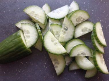 Огурец помойте, отрежьте кончики. Разрежьте плод вдоль пополам, а затем нарежьте половинки тонкими полукольцами.
