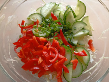 Как сделать салат Монастырский с капустой и перцем? Подготовьте продукты. Капусту, по возможности, возьмите свежую — она сочнее и мягче. Если же вы будете готовить салат из капусты поздних сортов, то выбирайте более сладкие и сочные. Кроме зеленого лука можете добавить в салат любую зелень по вкусу. Масло для заправки берите также любое — и рафинированное, и первого отжима, с запахом. Подойдет любое растительное — подсолнечное, оливковое и т.д.