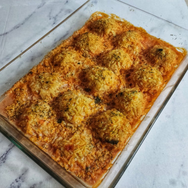 Далее добавила рис, муку, посолила,поперчила. Руками, смоченными в воде,сформировала шарики, выложила в форму для запекания. Залила соусом из майонеза,соуса и воды. Посыпала измельченной зеленью укропа.