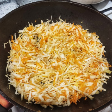 Добавить к луку нашинкованную капусту и морковь и жарить минут 5, помешивая