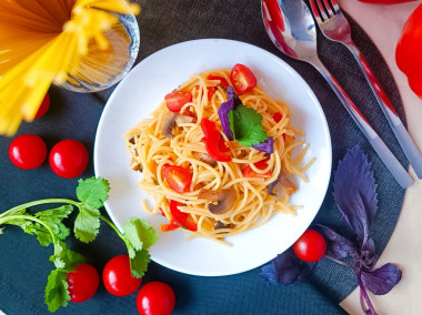 Постные макароны с грибами и овощами получились невероятно вкусными и ароматными. Сочетание сладковатого перца, сочных помидоров и пряного чеснока идеально дополняет вкус грибов. Все ингредиенты прекрасно сбалансированы, блюдо лёгкое, но в то же время сытное.