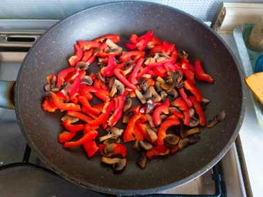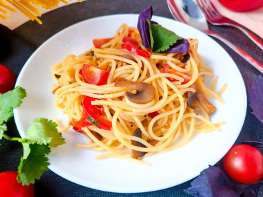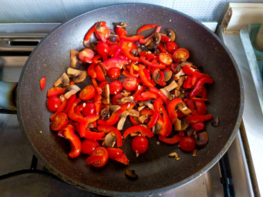 Поставила сразу закипать воду для макарон, параллельно с этим обжаривала по очереди грибы и овощи. Сначала обжарила грибы, через пару минут добавила к грибам болгарский перец - обжарила всё 5 минут. Затем добавила помидоры черри и чеснок, чеснок делала не через пресс, а порезала мелким кубиком, так он больше отдаёт запах и вкус. Пока овощи обжаривались отварила макароны. Затем всё вместе перемешала и дала постоять 5 минут, чтобы макароны пропитались этими великолепными запахами и соками от овощей.