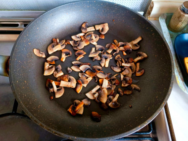 В сковороде на среднем огне разогрейте растительное масло. Выложите шампиньоны и обжарьте, помешивая, до золотистого цвета.