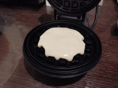 Разогрейте вафельницу. В зависимости от ее модели можете смазать панели каплей растительного масла без запаха. У меня вафельница с антипригарным покрытием, ее смазывать не нужно. Вылейте на разогретую панель пару ложек теста. Точное количество будет отличаться для каждой модели. Подробнее об особенностях работы вафельниц читайте в конце рецепта.