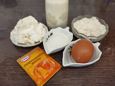 Тесто должно быть комнатной температуры. Так оно быстрее и равномернее пропечется. Яйцо вбейте в миску, добавьте к нему творожный сыр и молоко. Перемешайте продукты. Удобнее будет работать венчиком. Всыпьте к жидким ингредиентам сахар, соль и разрыхлитель. О нюансах работы с разрыхлителем читайте в статье по ссылке в конце рецепта. Частями всыпьте просеянную муку, каждый раз хорошо перемешивая.