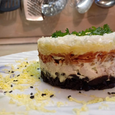 Вкусный и сытный - для праздничного настроения! Слоеный салат Марсель с черносливом и курицей - это настоящая феерия вкуса! Все ингредиенты очень гармонично сочетаются друг с другом. Салат Марсель получается не только очень вкусным, но и красивым