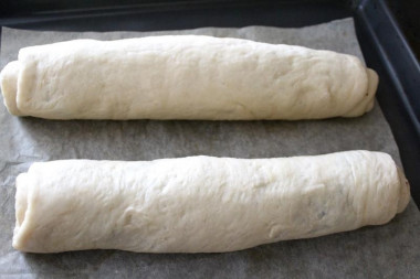 Аккуратно перенесите рулет на застеленный пергаментом противень, прикройте полотенцем или пищевой пленкой и оставьте для расстойки на 15 минут. Смазать рулет сверху можно сладкой водичкой или сладкой заваркой.