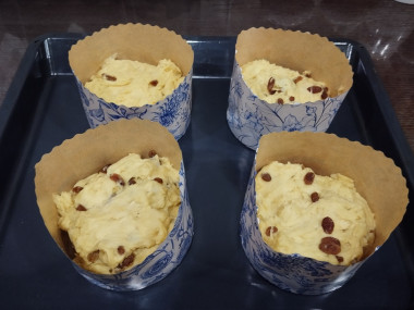 Аккуратно обомните тесто и разложите их в формы для куличей, смазанные небольшим количеством растительного масла. Я заполнила формы тестом примерно на 1/3. Если планируете оставлять куличи в формах, то заполняйте наполовину, чтобы верхушка при выпечке поднялась до верхнего уровня. У меня получилось 2 формы размером 11*8,5 см и 3 формы 9*9 см.