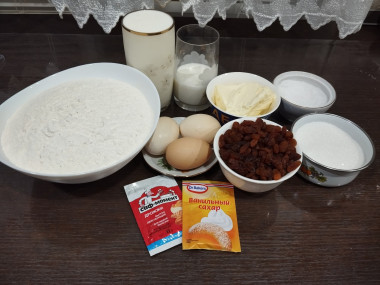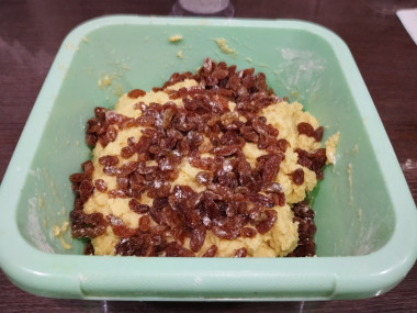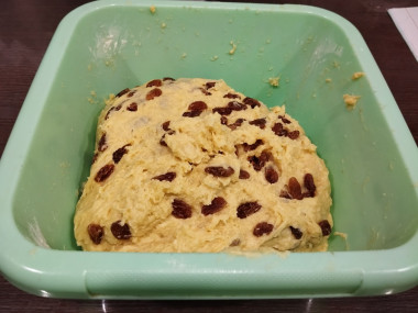 Из сухофруктов брала только изюм,который промыла,залила кипятком, обсушила. Тесто приготовила строго по рецепту.