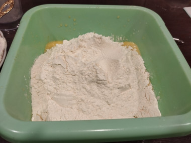 Всыпьте просеянную муку. Просеивание обогатит муку кислородом, и тесто хорошо поднимется, а выпечка получится пышной и воздушной. Всыпьте примерно ¾ количества муки, перемешайте. Остальную муку подсыпайте небольшими порциями. Муки может понадобиться больше или меньше указанного количества. О свойствах муки читайте после описания рецепта.