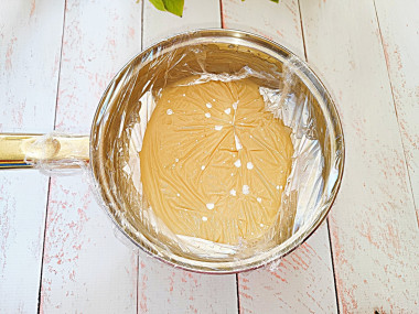 Готовый крем снимите с огня, накройте пищевой пленкой «в контакт» и дайте ему остыть.