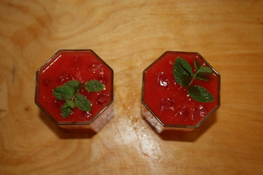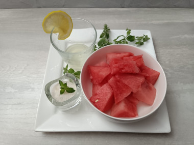 Сразу отправила в морозилку очищенные кусочки арбуза, они заменят лёд в напитке. Заварила лимонно - сахарный сироп в микроволновке. Пока сироп остывает, подготовила арбуз. Очистила его от семян и кожуры, нарезала и отправила в чашу блендера. Соединила арбуз, сироп и мяту , ещё раз взбила. Фужер наполнила арбузным льдом и напитком из блендера. Украсила мятой. Арбузный фреш получился ярким с насыщенным вкусом.