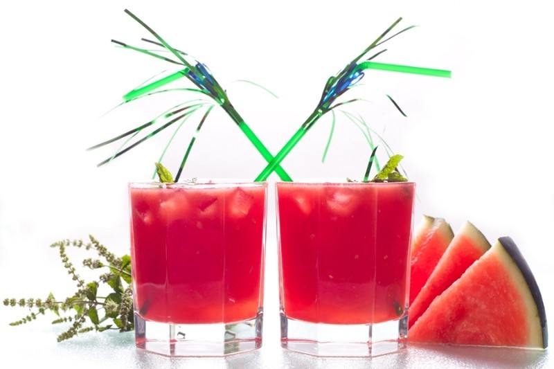 Поэтому, если уж очень хочется отведать арбузного фреша, приходится хитрить: во-первых, вводить туда сахар (чтобы не получилось совсем уж не сладко), во-вторых - сок лайма (чтобы освежить и интенсифицировать вкус) и в-третьих - веточку мяты, чтобы не требовалось слишком много льда, а свежесть была.