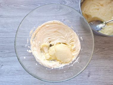Соедините всю заварную массу со сливочным маслом, добавляя ее постепенно небольшими порциями. Взбейте до получения пышного, однородного крема.