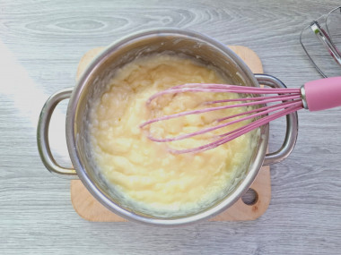 Постепенно заварная основа начнет густеть. Убавьте нагрев и, продолжая активно помешивать, доведите массу до загустения. Проварите 1 минуту и снимите с плиты.