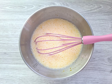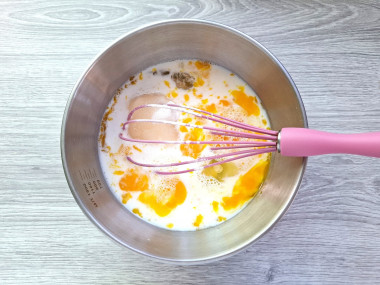 В горячее молоко при постоянном помешивании венчиком влейте тонкой струйкой яично-молочную смесь.