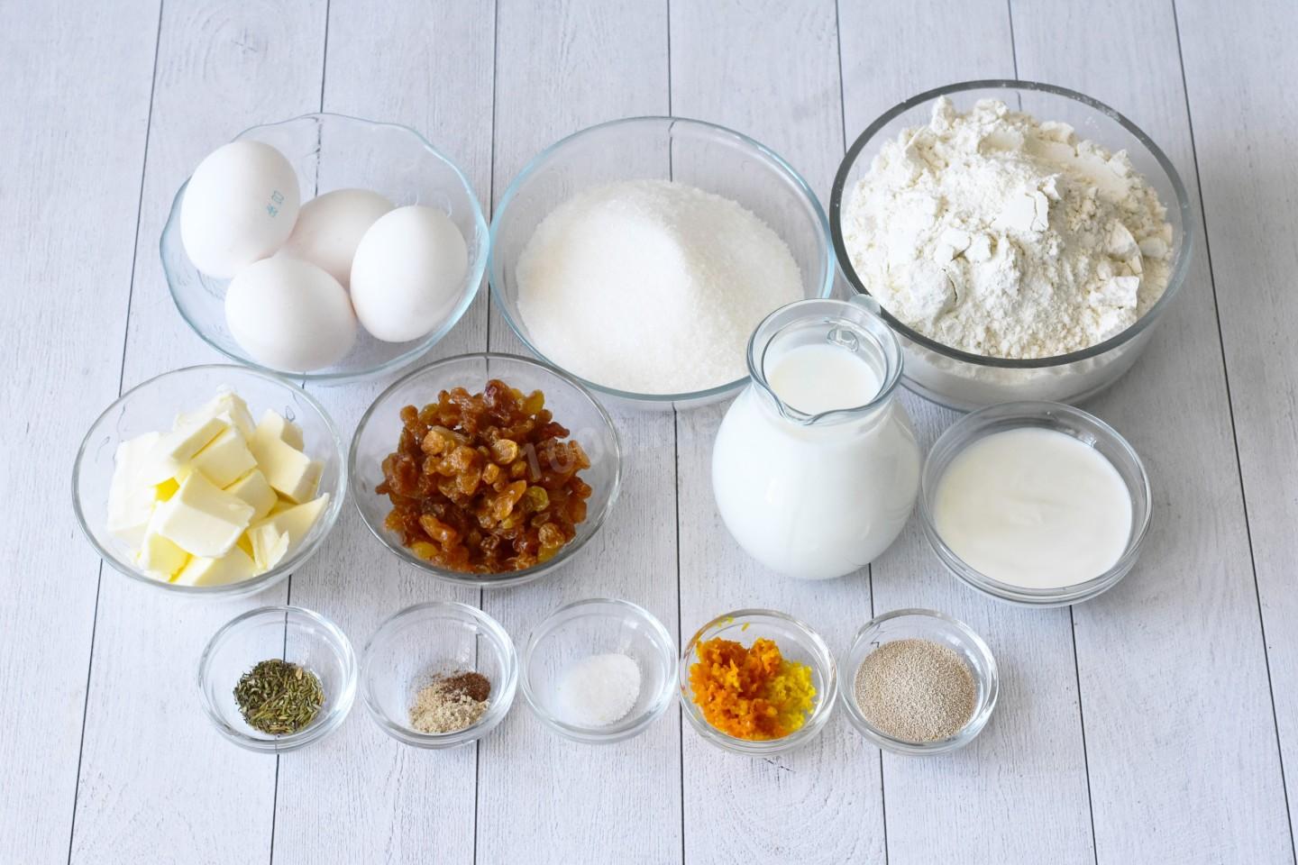 Подготовьте ингредиенты по списку. Муку берите высшего сорта. Перед тем, как покупать дрожжи, почитайте инструкцию. Нам нужны дрожжи, которые активируются жидкостью. Изюм предварительно вымойте и обсушите.