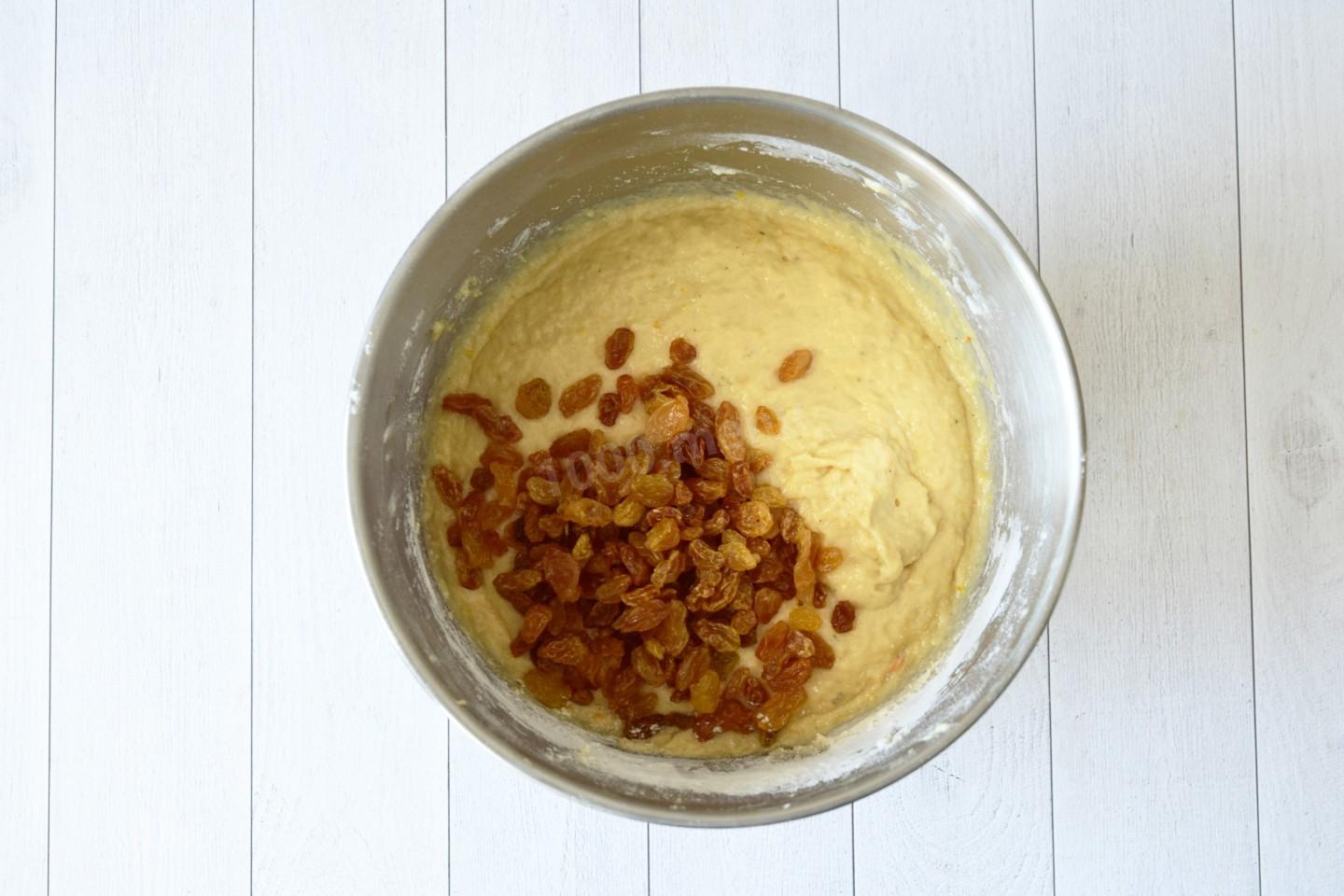 В конце вмешайте промытый изюм. Должно получиться однородное вязкое липкое тесто.