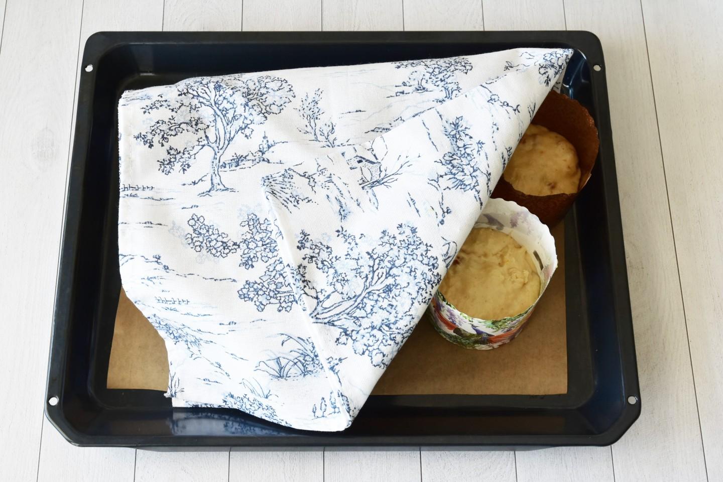 Миску с тестом затяните пищевой пленкой и поставьте на 1,5 часа в тепло для подъема. Я ставлю в теплую выключенную духовку. Затем подошедшее тесто разложите в смазанные маслом формы для куличей, заполнив их на треть. Накройте полотенцем и оставьте в тепле для подъема на 30 минут. Включите духовку на 180 градусов.