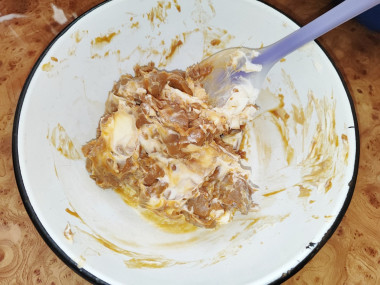 Сгущенку выложите в миску, добавьте к ней размягченное сливочное масло. Миксером взбейте масло со сгущенкой до однородной пышной массы.