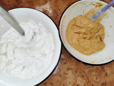 Добавьте к творогу крем из сгущенки, перемешайте получившуюся массу лопаткой. Влейте жирные сливки. Взбейте все вместе миксером до однородности.