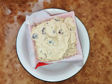 Добавьте клюкву к творожной массе, перемешайте лопаткой.