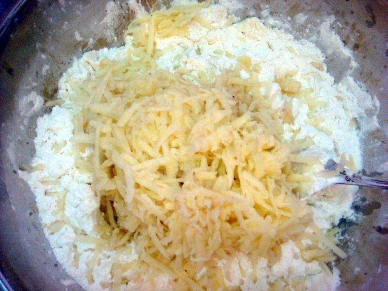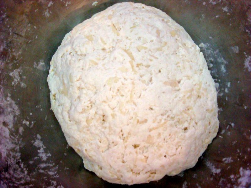 Получается очень плотное тесто. Если тесто не собирается в один ком, значит ему мало влаги и нужно добавить еще картошки. Ни воды, ни яиц добавлять не надо.