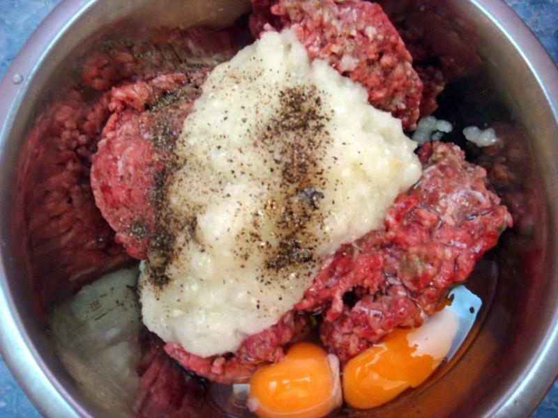 Как сделать пызы картофельные белорусские со свининой и говядиной? Подготовьте все необходимые ингредиенты. Из свинины и говядины сделайте фарш. Посолите, поперчите, добавите яйцо и мелко нарубленный лук.