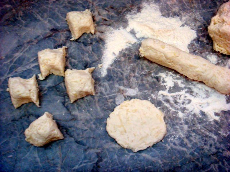 Тесто разделите на колбаски, разрежьте их на кусочки, сделайте лепешки толщиной 5-6 мм.