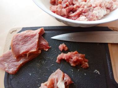 Займитесь мясом. Если фарш готовите в домашних условиях, то мясо нужно промыть, изрубить мелко ножом или пропустить через мясорубку с крупной насадкой (второй вариант быстрее и проще, но с первым получится вкуснее).