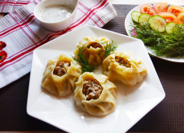 Вместо привычных мантов приготовлю сегодня бууз)). Замесила достаточно тугое тесто , положила его в пакет отлежаться. Тем временем приготовила фарш из рубленого мяса ( так мне больше нравится, чем с фаршем, да и времени было достаточно, не торопилась) . Количество лука увеличила, у нас все любят много лука в мясных блюдах. Тесто получилось эластичное, легко раскатывалось до тонкости и лепилось тоже легко. Не знаю какими по размеру должны быть бууз, сделала крупные, чтоб начинки было побольше))) Готовила в мантоварке 40 минут. Подавала со свежими овощами и сметанным соусом с зеленью. Тонкое тесто и много сочной начинки. Очень вкусно! Спасибо, Snezhana!