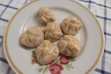 Возьмите это лепешечку в ладонь левой руки. Ложкой положите в центр лепешки мясо и начните защипывать пальцами правой руки края теста, формируя из них складочки. В центре оставьте отверстие для выхода пара во время варки.