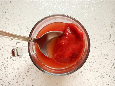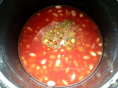 У меня фасоль белая, варится она быстрее красной. Да и замачивание на ночь сокращает время тепловой обработки. Томатную пасту я обычно замораживаю порционно. В горячей воде она быстро оттаяла и растворилась. Также в кастрюлю добавила овощную приправу и соль. Тушила примерно 30 минут, за это время томатная подливка уварилась вполовину.