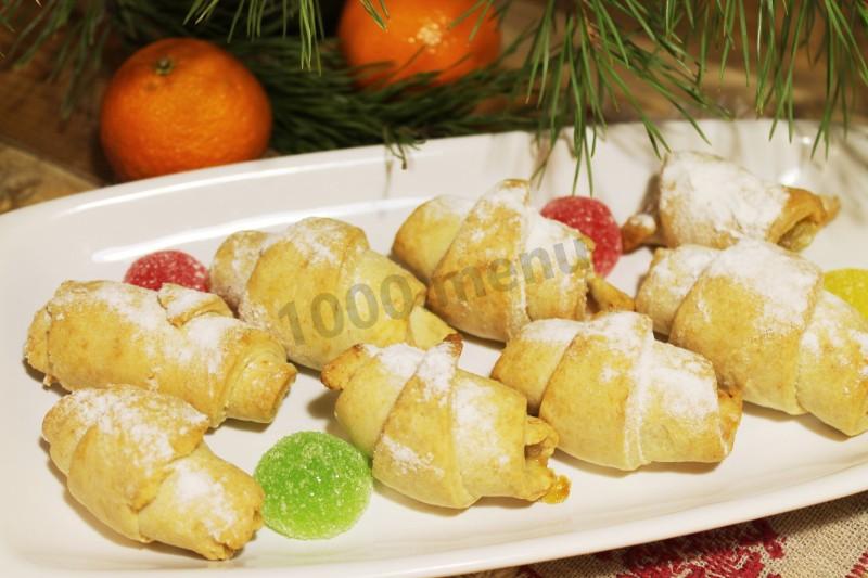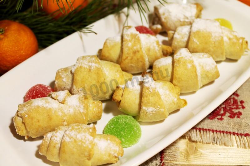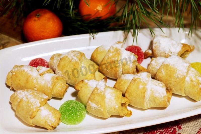 Готовые рогалики присыпьте для красоты и аппетитности сахарной пудрой. Заваривайте свежий чай и подавайте песочные рогалики с мармеладом к чаю!