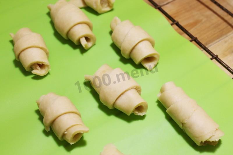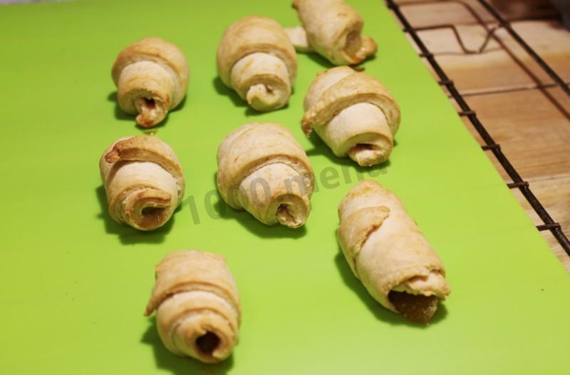 Затем тесто раскатайте в пласт 0,4-0,5 см толщиной, нарежьте остроугольные треугольники. На широкий край кладите мармеладку и сворачивайте трубочкой, формируя рогалики.