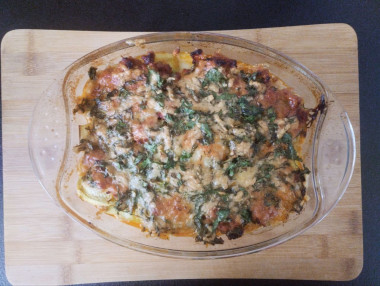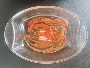 Возьмите форму, подходящую для запекания в духовке. У меня керамическая, размером 23*16см. Смажьте ее дно остатками соуса. О том, как выбрать форму для запекания, читайте в отдельной статье по ссылке в конце рецепта.