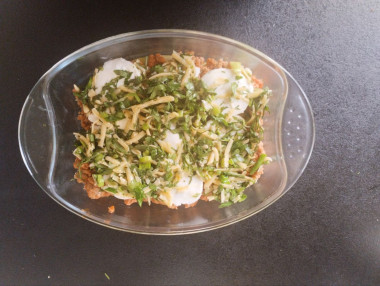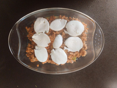 Распределите по фаршу половину сырно-яичной массы. Посыпьте все это половиной моцареллы.