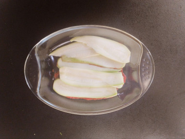 Выложите на дно пластины кабачка, а на него половину фарша.