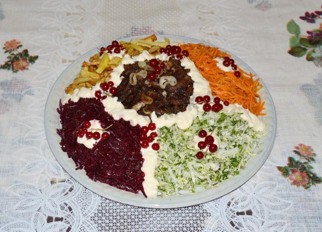 Теперь укладываем на большое блюдо наш салат секторами: корейскую морковь, картофель фри, свеклу, капусту. В центре салата укладываем мясо. Украшаем салат майонезом. И последний штрих - я украсила его ещё красной смородиной. Всё, Ералаш готов! Ставим его в холодильник для охлаждения на часок-другой. В таком виде подаем на стол. Если нет среди гостей или членов семьи людей на диете, - перемешиваем все ингредиенты двумя вилками. Приятного аппетита!