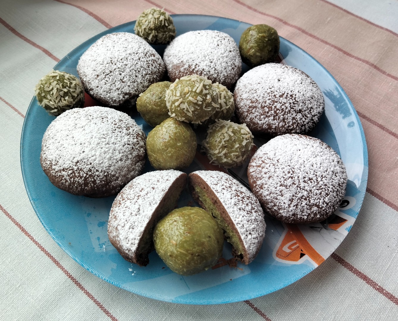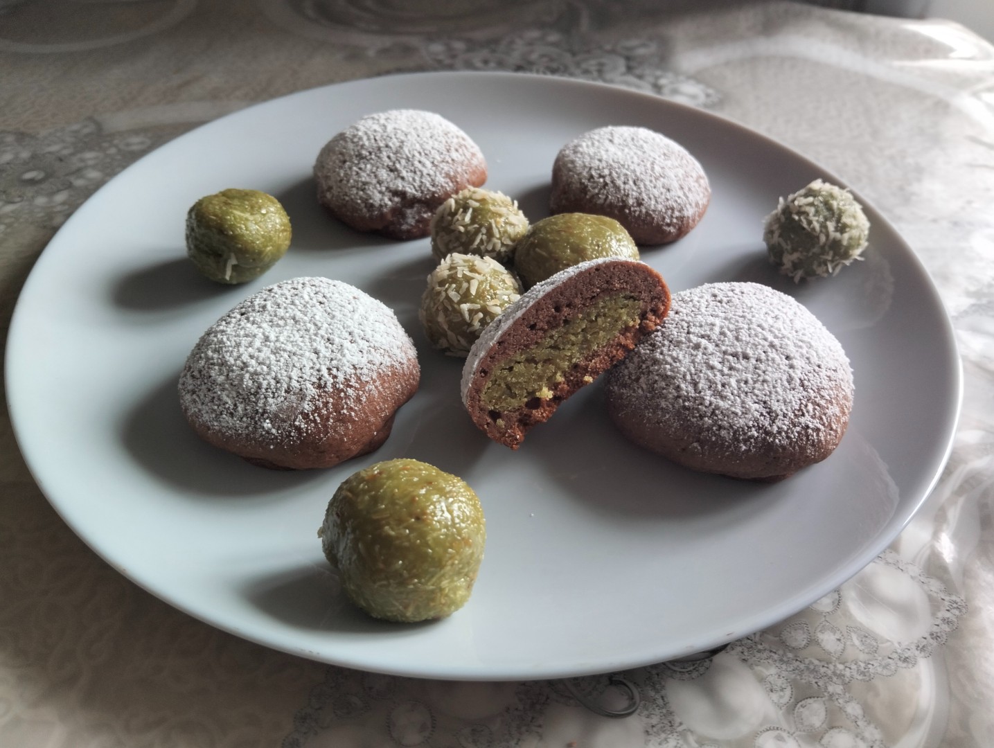 Теста на всю начинку не хватило. Из оставшейся начинки накатала шариков и обсыпала кокосовой стружкой. Получилось что-то типа фисташкового Рафаэлло :))